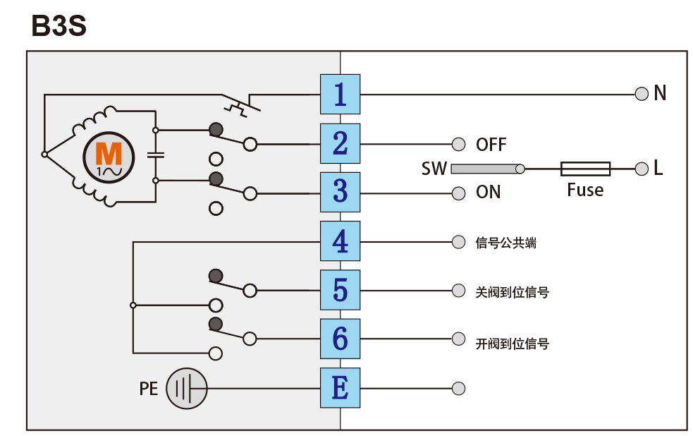 SW切換至 2 ,電動(dòng)執(zhí)行器將順時(shí)針旋轉(zhuǎn),到位后4與5接通,給出關(guān)閥到位信號(hào)。