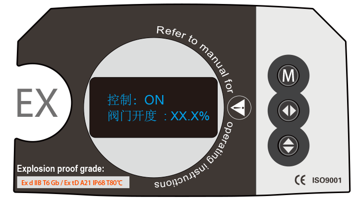 采用0.96寸OLED液晶,無視角限制,高亮度,節(jié)能環(huán)保,實時顯示閥門開度及其外部控制命令,約5分鐘后自動進入休眠狀態(tài),并在休眠期間提示位置狀態(tài)及其控制命令。