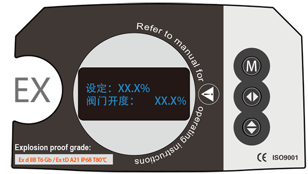 采用0.96寸OLED液晶,無視角限制,高亮度,節(jié)能環(huán)保,實(shí)時(shí)顯示閥門開度及其外部控制命令,約5分鐘后自動(dòng)進(jìn)入休眠狀態(tài),并在休眠期間提示位置狀態(tài)及其控制命令。